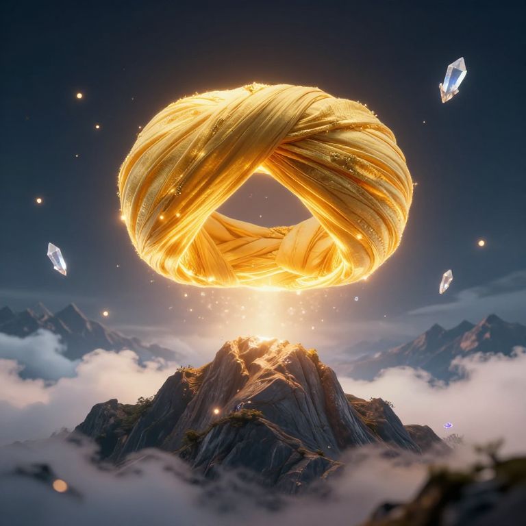 A magical fantasy scene where a glowing golden turban hovers above a mountain peak, surrounded by floating crystals and ethereal clouds, fantasy style, hyper-detailed, surreal realism, cinematic depth.