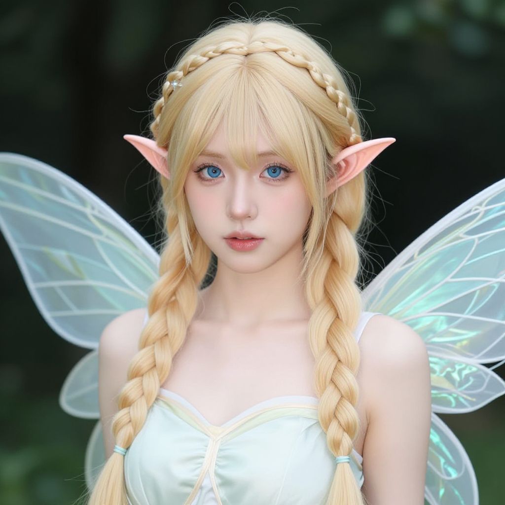 Digital CGI image of a young, fair-skinned, blonde elf woman with long hair, pointed ears, blue eyes, wearing a white tank top and