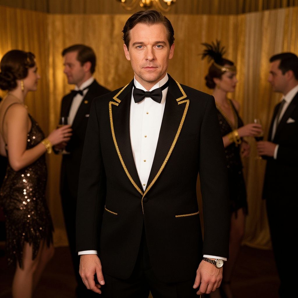 A man dressed in an elegant Gatsby-style tuxedo stands confidently at a vintage-themed party. The detailed black tuxedo with gold trim, bow tie, and pocket watch chain perfectly captures the 1920s fashion aesthetic amid a lively social gathering.