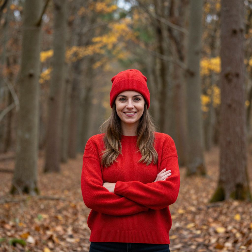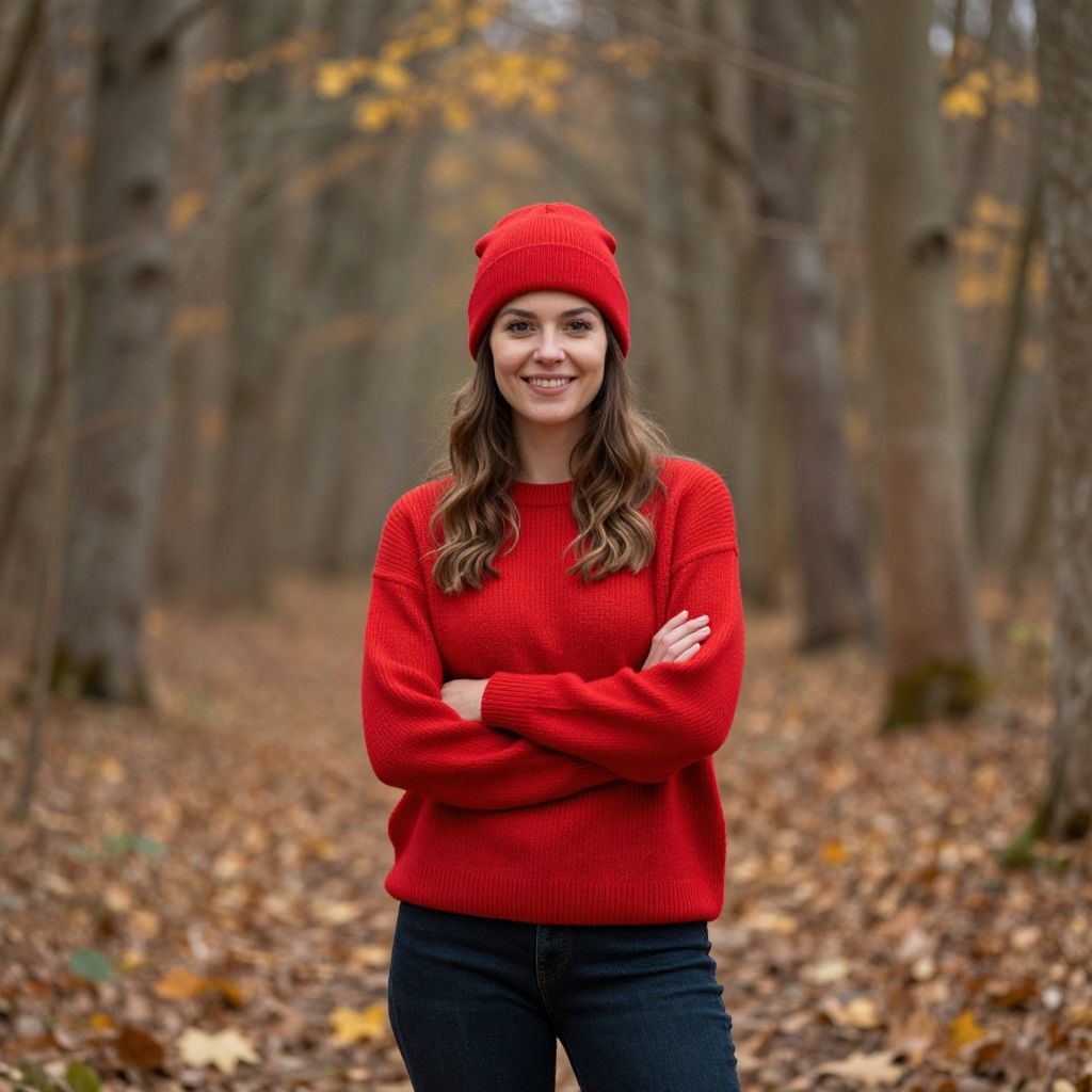 Smiling woman wearing a vibrant red sweater and matching beanie stands confidently with arms crossed in a serene forest setting, surrounded by tall trees and scattered golden leaves.