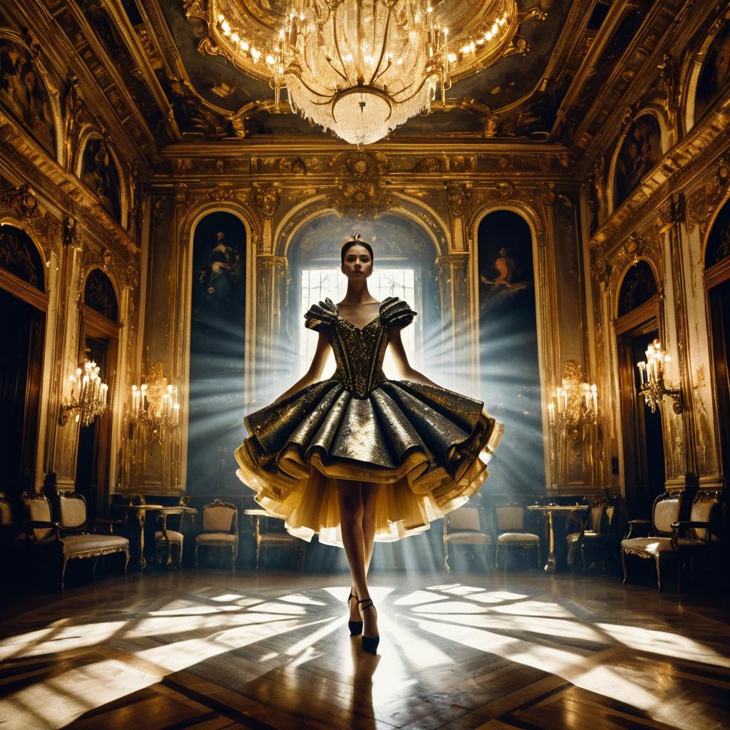 Dramatic high-fashion editorial image of a female avant-garde dancer wearing a structured metallic couture dress. She stands poised in the center of an opulent baroque ballroom bathed in warm golden light. Granular dust particles shimmer around her, highlighted by beams illuminating the intricate architectural details and lavish decor. The scene has a cinematic atmosphere with oil painting texture, evoking Vogue cover style.