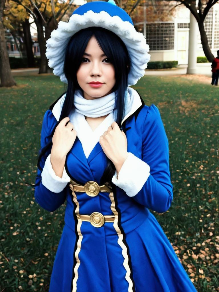 Sexy cosplay woman character wearing Juvia Lockser costume. Realistic photo. Jane Doe dressed as Juvia Lockser --sref 1388