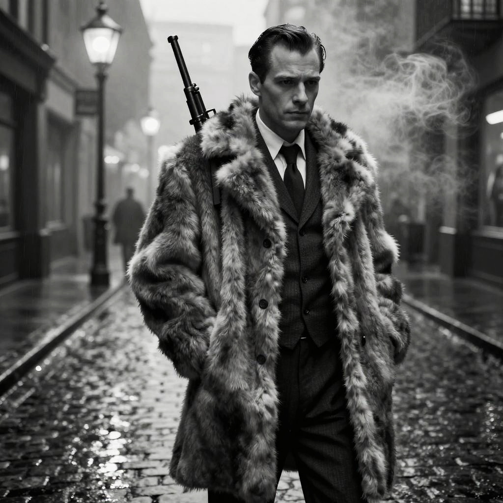 Gangster fur coat worn by a stylish outlaw in a retro noir setting, rain-slicked cobblestone street, classic Tommy gun slung over the shoulder, smoky haze surrounding lamplight, intricate fur details glowing softly in monochrome shadows, evocative and dramatic.