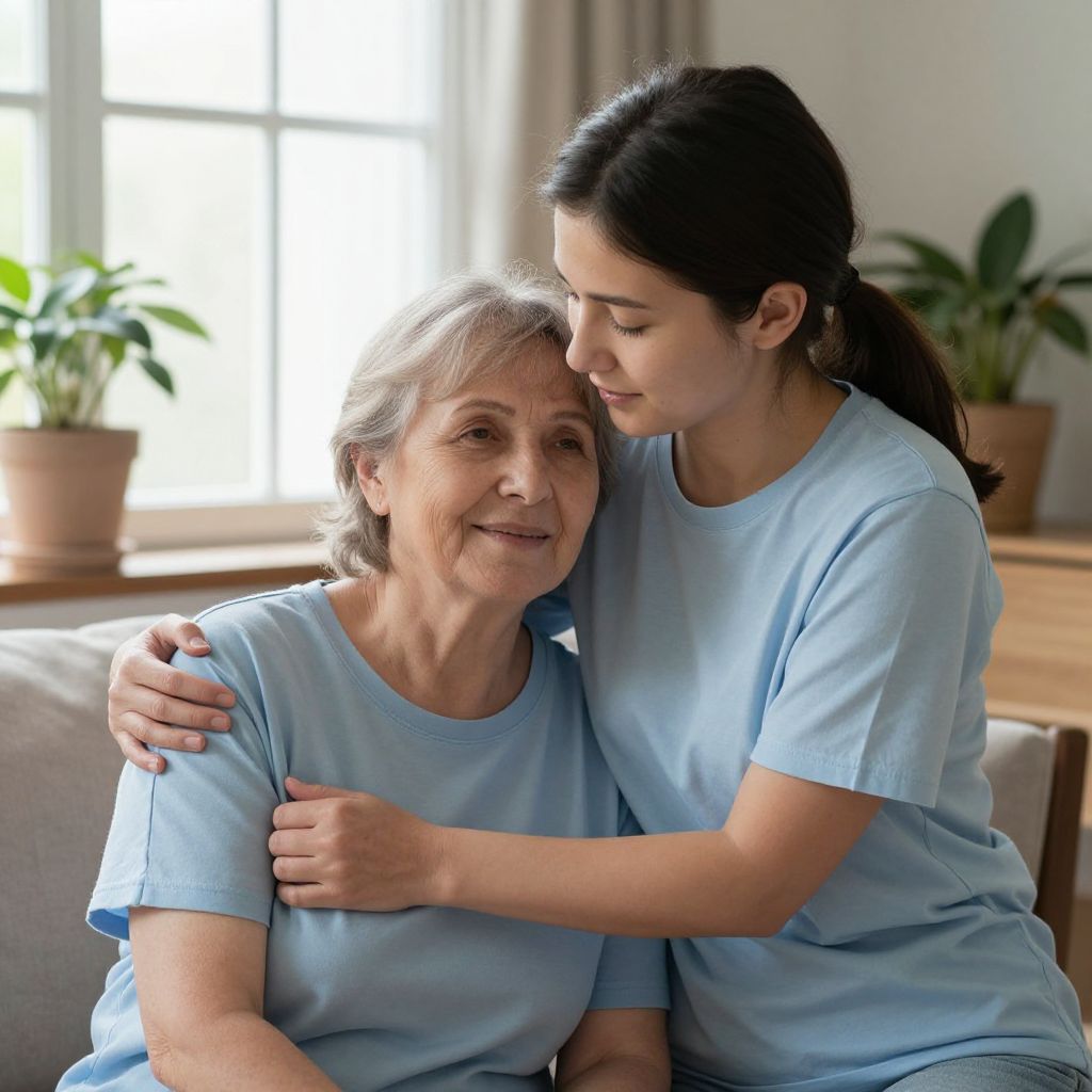 Photograph of a young woman with dark hair hugging an elderly woman with gray hair, both wearing light blue shirts, smiling in a bright, cozy