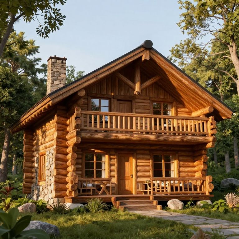 A rustic log cabin with custom design features, showcasing a warm, inviting aesthetic with golden-hour lighting, crafted in a high-definition 3D render that highlights its natural wood textures and stone accents amidst a serene forest setting.