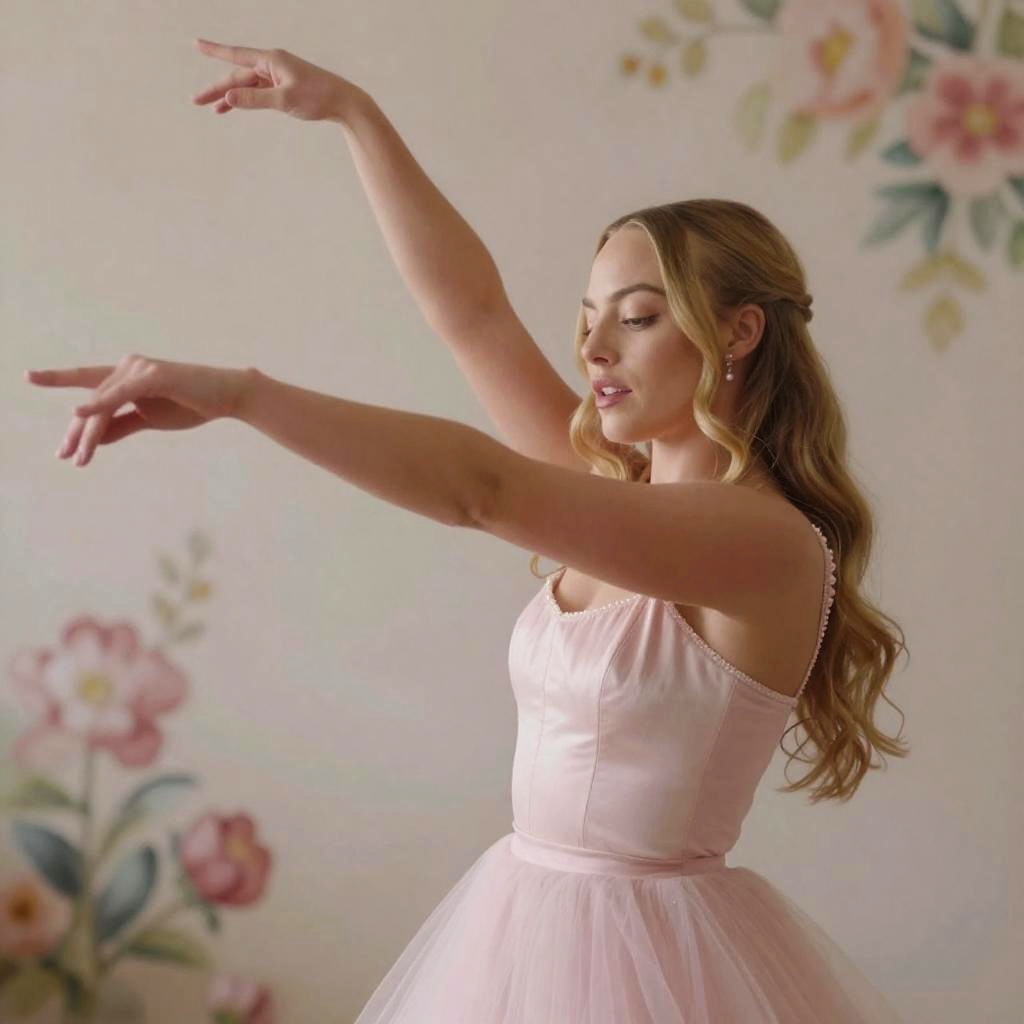 Margot Robbie arms extended in dance motion, soft focus background with floral motifs, pastel color palette, dreamy and whimsical mood, impressionistic style portrait