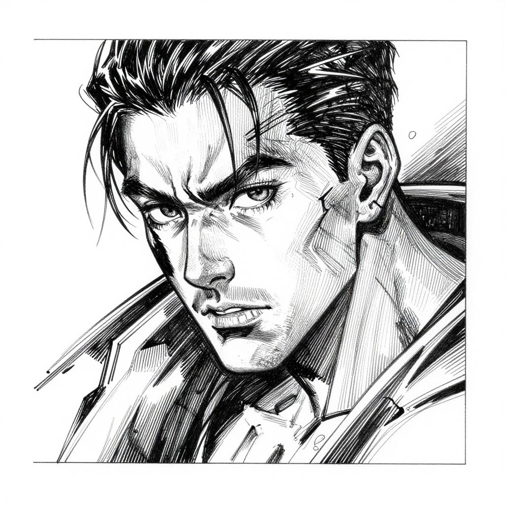 Black and white manga-style illustration of a stern, handsome man with dark, slicked-back hair, intense eyes, and strong jawline, wearing a