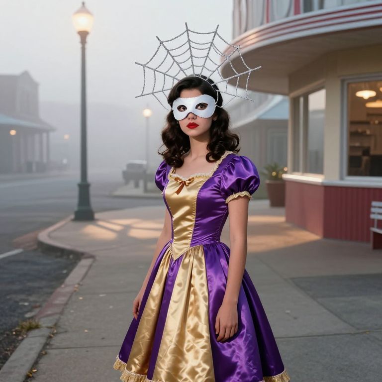 A naturalistic outdoor scene of a teenage girl with dark wavy hair and wide, curious eyes, dressed as a classic movie Halloween character from the 1950s — wearing a full-length purple and gold satin dress with a large silver spider web headdress and a vintage-style face mask with red paint on the lips, standing outside a vintage diner in a small town, with fog rolling in and streetlights casting long shadows