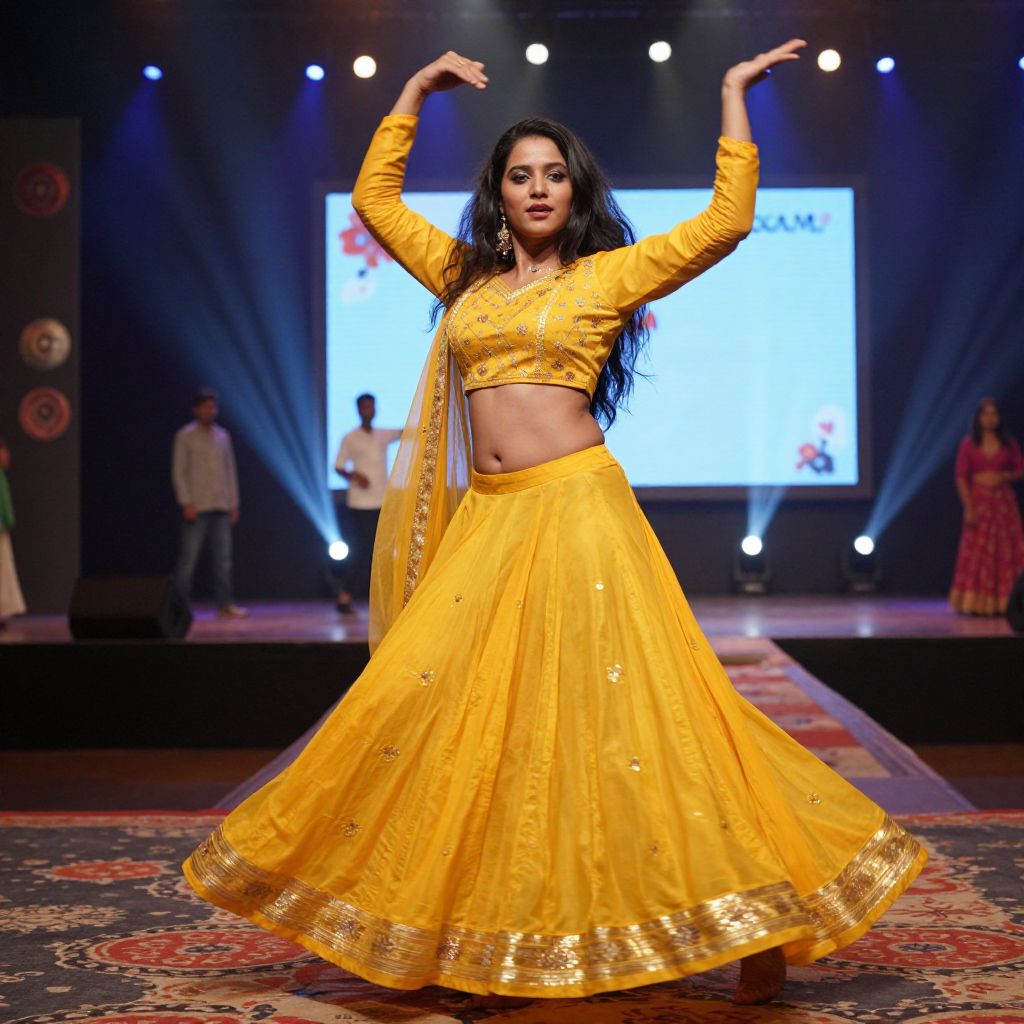 Photograph of a South Asian woman with long black hair, medium brown skin, and a curvy figure, performing a traditional dance on a brightly lit runway. She wears a vibrant yellow cropped top and flowing skirt adorned with gold embroidery, with a matching dupatta draped over her shoulder. Her arms are raised gracefully above her head. The background features a blue-lit stage with spotlights, a large screen displaying a logo, and other dancers in traditional attire. The runway is covered with a richly patterned carpet. The overall atmosphere is festive and elegant.