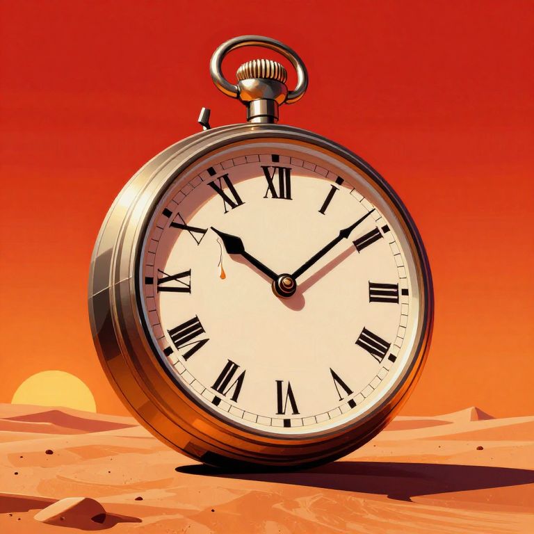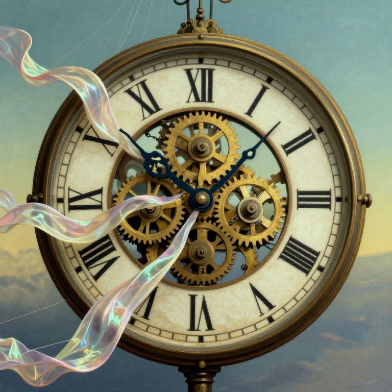 Envision an intricate digital artwork blending surrealism reminiscent of Dalí's masterpieces with the detailed intricacies of anime art. The canvas showcases a colossal clock face suspended above a tranquil landscape, housing a miniature, vibrant village on its surface. The architecture is sculpted into the clock face, featuring houses and towers intertwined with clock hands. As time progresses, day seamlessly transitions to night, evoking an emotional spectrum from peace to anticipation. Sunset behind distant peaks instills a sense of nostalgia and marvel, beckoning viewers to delve into this dreamlike realm where reality intertwines with dreamscape, inviting exploration in a world where the passage of time is both mesmerizing and malleable.