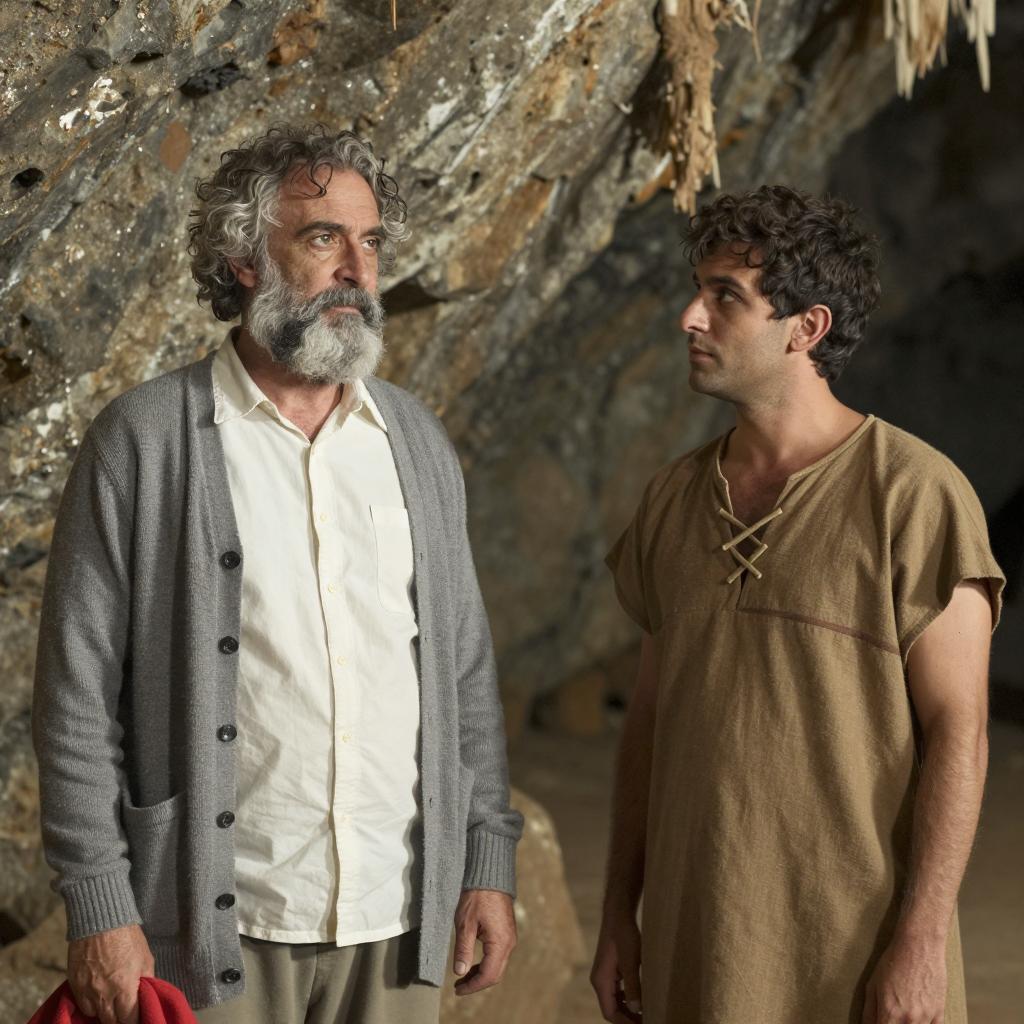 Two men standing and facing each other inside a rocky cave. The man on the left has gray curly hair and a full gray beard, wearing a gray cardigan over a white button-up shirt and holding a red cloth. The man on the right has short dark curly hair and is dressed in a simple brown tunic with a crisscrossed front. The background features rough, textured cave walls.