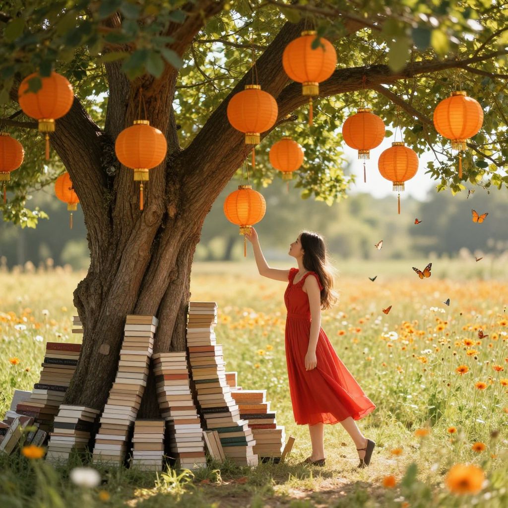 Books rest in neat stacks against the gnarled trunk of a vibrant tree, its branches adorned with glowing orange lanterns that hang like fruit, while a young woman in a flowing red dress reaches out to touch them, surrounded by a field of wildflowers and butterflies dancing in the sunlight.