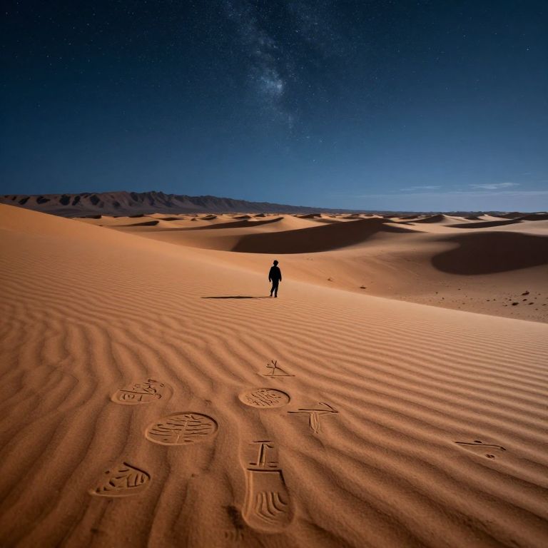 An enigmatic desert landscape unfolds under the captivating glow of a star-studded night sky, captured from an unconventional low-angle perspective as if seen through the eyes of a miniature adventurer trekking across expansive sand dunes. Intricate patterns and cryptic symbols etched into the desert's surface tantalize the viewer with their hidden meanings, while far-off mountains cast elongated shadows towards a horizon bathed in otherworldly light. This surreal scene instills an atmosphere of wonder and intrigue, beckoning audiences to embark on a spellbinding exploration through the enigmas concealed within this extraordinary alien terrain.