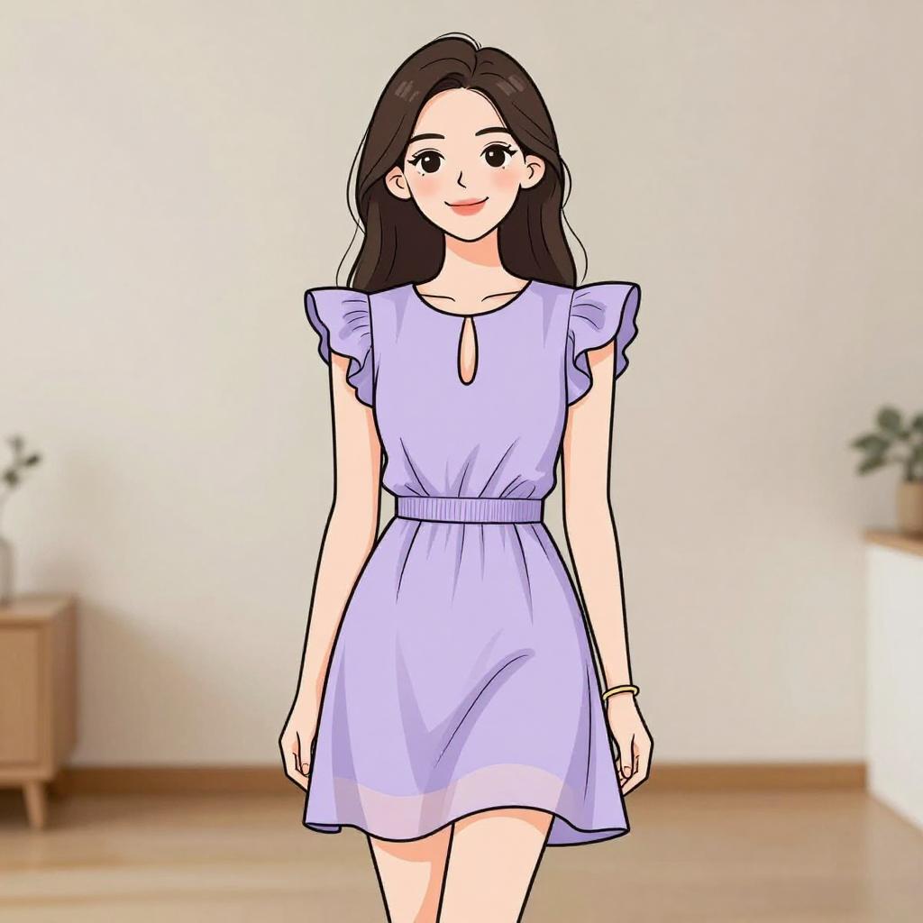 Woman with pretty face and pretty hair. smiling Woman, contemporary casual, lilac mini dress with a subtle sheen, keyhole neckline, ruffle cap sleeves, cinched elastic waist, chiffon-like overlay, soft draping, sheer panel at the hemline, simple gold bangle, neutral interior background with a light wood floor and minimalistic style. --sref 1467