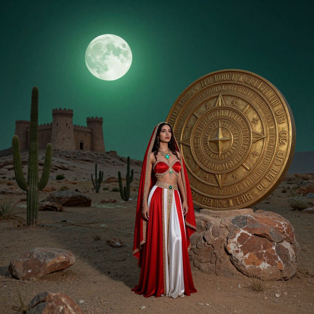 The image presents a striking and highly detailed scene set in a desert landscape under a full, glowing green moon. A woman in a vibrant red and white dress stands prominently in the foreground, her attire adorned with intricate details and jewels that catch the light. She is positioned near a large, ornate circular emblem that bears inscriptions and symbols, adding an air of mystique to the scene. The background features a desolate, rocky terrain with cacti and a distant, crumbling castle, evoking a sense of abandonment and mystery. The sky is dotted with stars, and the overall color palette is dominated by shades of green, red, and gold, creating a surreal and otherworldly atmosphere. The composition is carefully arranged, with the woman and the emblem serving as focal points, while the desert landscape and celestial elements frame the scene, creating a harmonious balance between the natural and the supernatural. The image is rich in texture, from the smooth, reflective surfaces of the moon and the emblem to the rugged, rough surfaces of the desert and the castle. The interplay of light and shadow, as well as the use of high contrast and post-processing effects, enhances the dramatic and enigmatic quality of the scene.