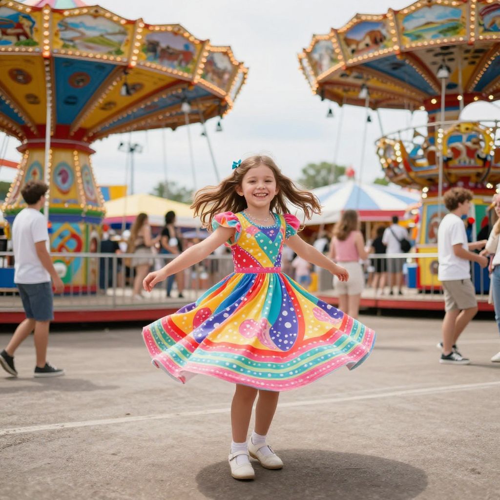 A joyful young girl spins in her colorful dress at a vibrant carnival. The lively background features classic amusement rides, highlighting the fun and excitement of a day at the fair.