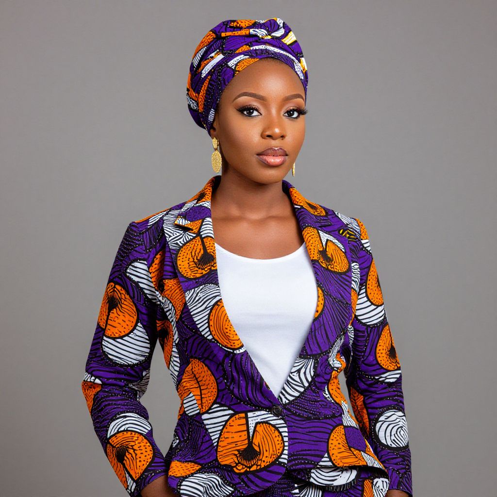 Elegantly styled woman showcasing vibrant African print attire, featuring a matching turban and blazer with bold purple, orange, and white patterns, complemented by a sleek white top and gold earrings, exuding cultural fashion flair. #african #ankarastyles #turban