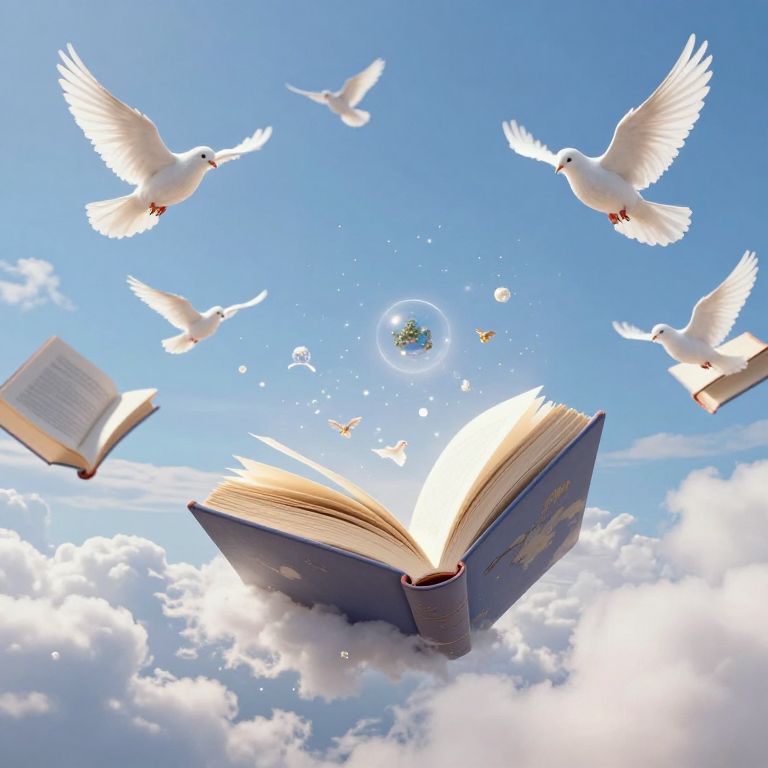 In a whimsical 3D-rendered scene, a serene sky dotted with fluffy clouds is alive with floating books, their pages magically turning to unveil hidden worlds, while ethereal white doves glide gracefully among them, blending the realms of imagination and nature in a dreamlike, high-definition fantasy.