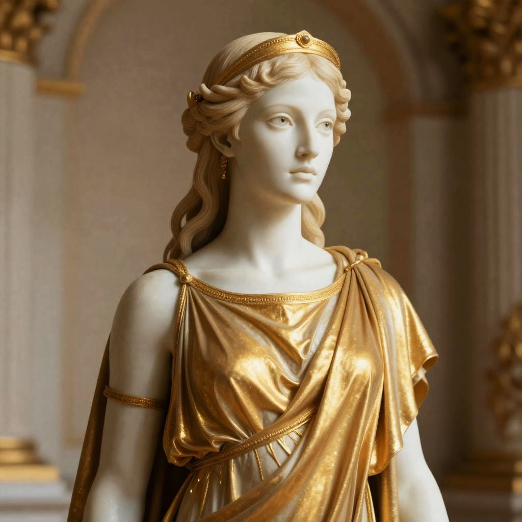 Realistic photo.female Roman goddess alien creature portrait with a golden hue effect and opulent imperial atmosphere. The creature has porcelain skin, wearing a flowing toga, captivating gaze, depicted with high detail to evoke a demigod quality. realistic photo