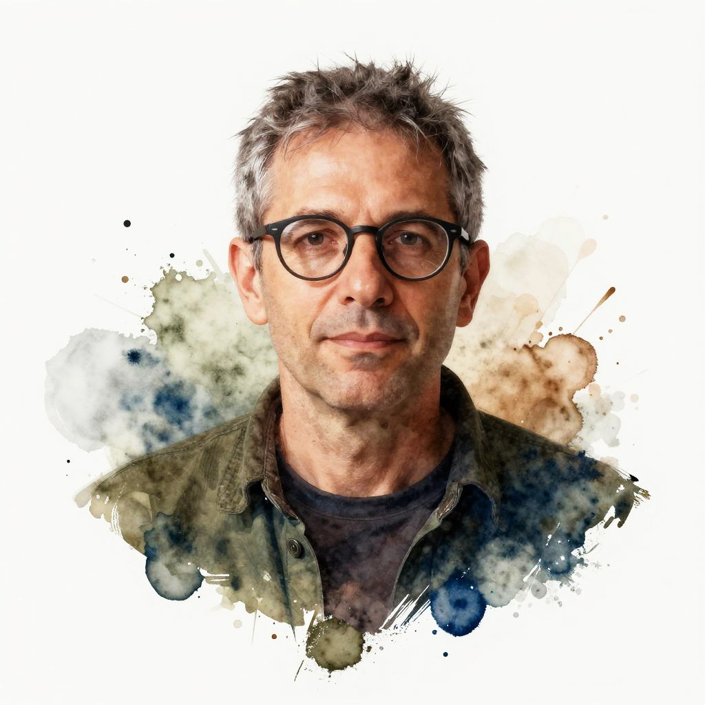 A stylized portrait of a boy with tousled dark blonde hair and a mischievous smile. He is shown from the chest up, with watercolor splashes in green, yellow, and blue surrounding the background and parts of his clothing for a creative, artistic effect.