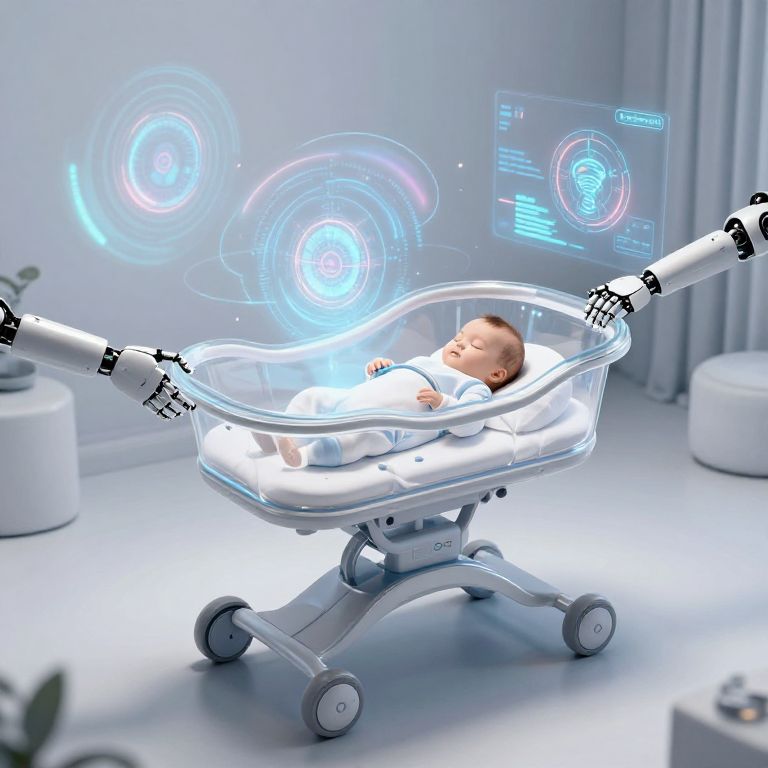 Snoo, futuristic baby sleep companion inside a softly lit nursery room, surrounded by calming holographic projections and gentle robotic arms rocking the bassinet, smooth white and silver surfaces, high contrast with delicate shadows, digital concept art