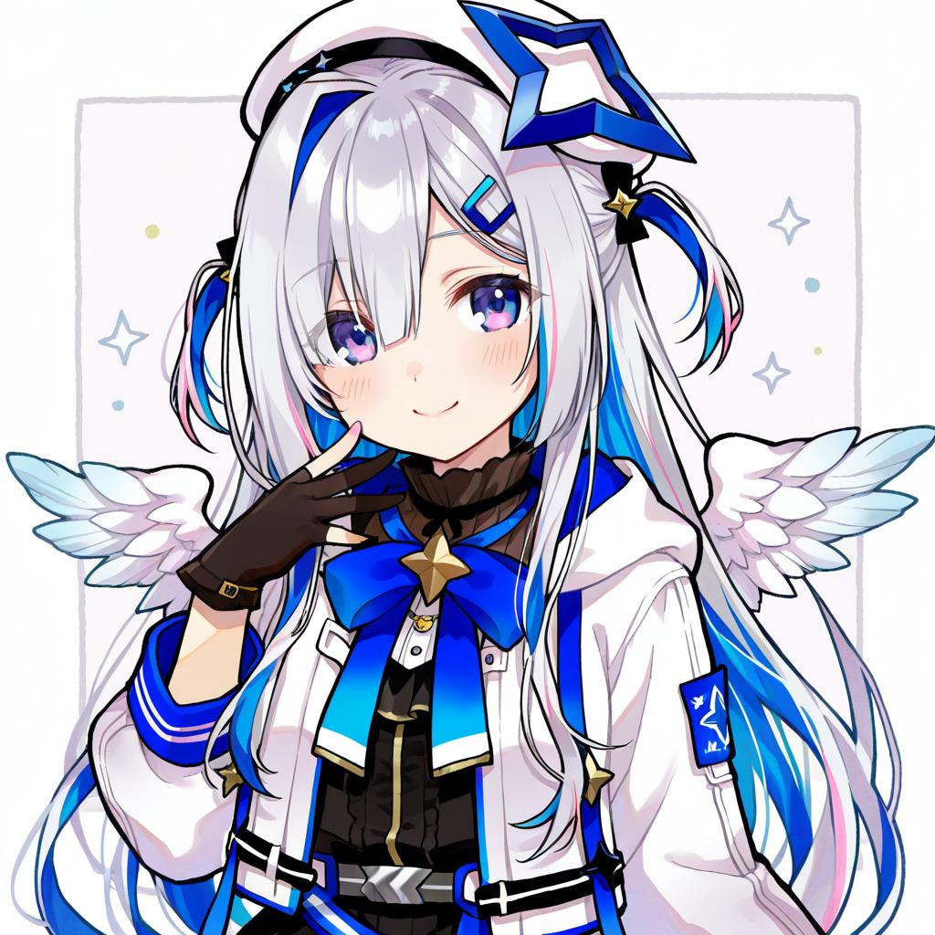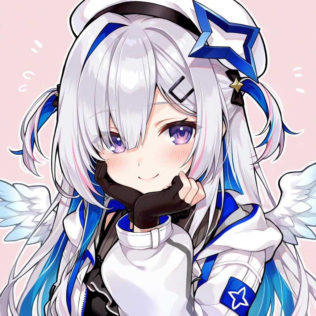 Amane kanata (work), hololive, 1girl, angel wings, angel, angel wings, purple eyes, hair over one eye, blue hair, grey hair, colored inner hair, single hair intake, official alternate hairstyle, long hair, official alternate hair length, streaked hair, pink hair, asymmetrical bangs, two side up, hairclip, black gloves, partially fingerless gloves, white jacket, black dress, white headwear, star halo, virtual youtuber, virtual youtuber, feathered wings, white wings, mini wings, feathered wings, white wings, mini wings, beret, by artist doradorakingyo, illustrious
