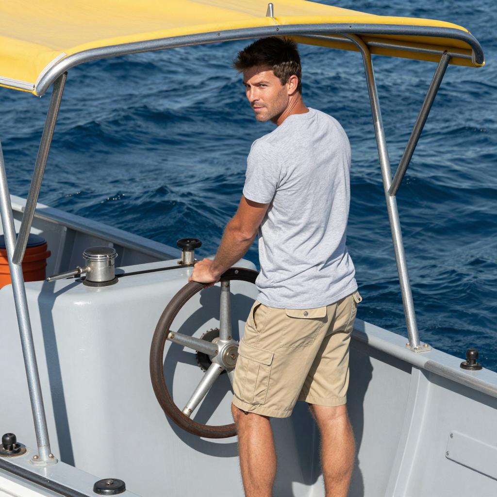 Photograph of two men on a small fishing boat in the ocean. Man on left stands on roof, holding rope, wearing blue shirt and jeans, looking ahead. Man on right stands on deck, holding rope, wearing gray shirt and dark pants, looking forward. Boat has yellow life raft, rope structure on left, blue sky with clouds in background. Boat name "M.S. 18 U.S." visible on side. Both men have short hair and medium builds. Water is deep blue with small waves.