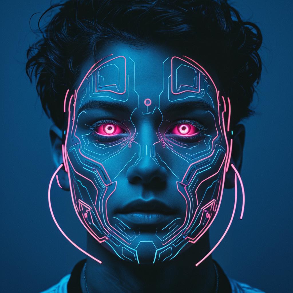 Black and white close-up portrait of a synthetic human face covered in a detailed pointillism pattern resembling fractured glass texture. The artwork features empty, intense eyes and a minimalist, dystopian atmosphere inspired by Yayoi Kusama's style.
