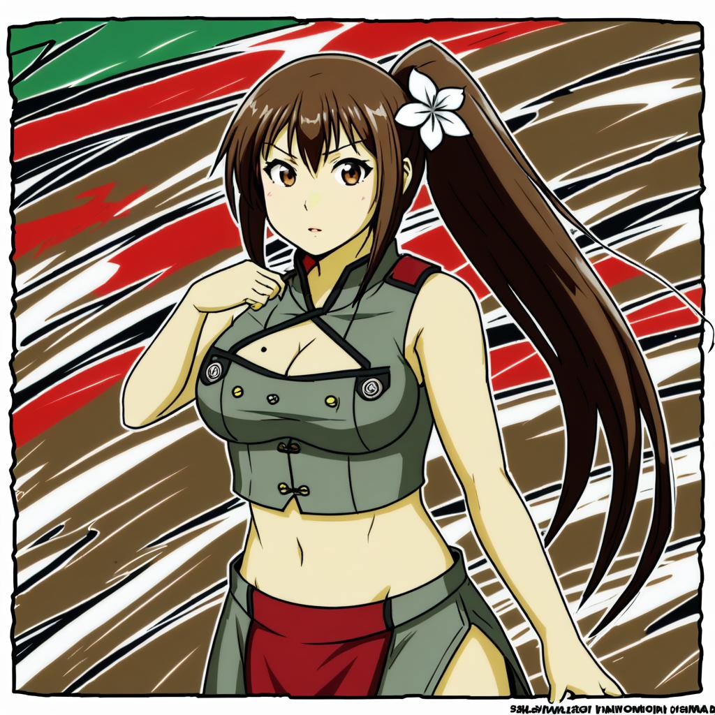 Anime-style illustration of a young woman with long brown hair tied in a high ponytail adorned with a white flower. She has brown eyes and a mole under one eye, wearing a green crop top with a cleavage cutout and a matching skirt with a red accent. The background features abstract streaks of red, brown, black, white, and green.