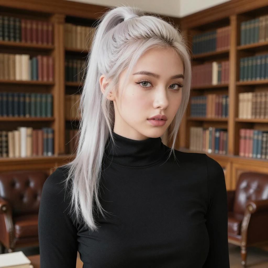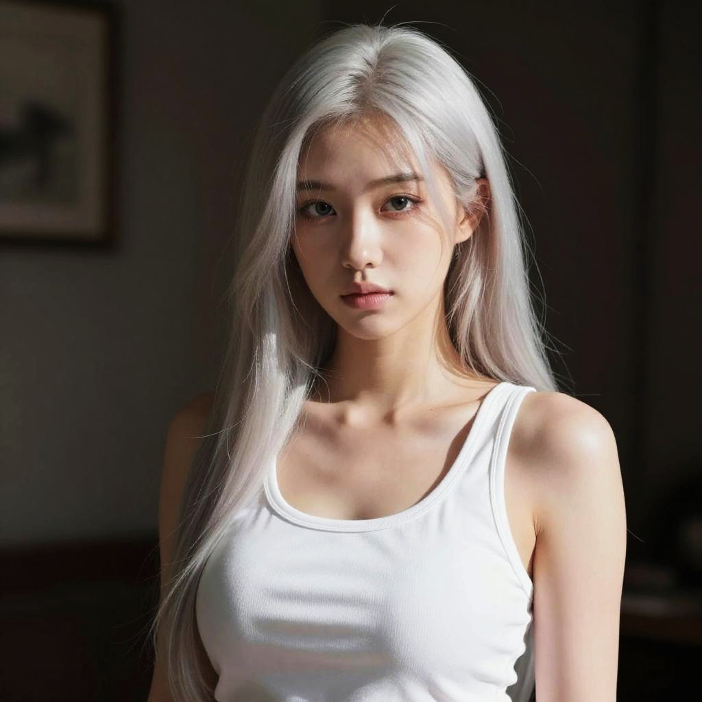 Photorealistic image of a slender woman with long white hair and fringe wearing a tight white dress standing on a city rooftop. The woman is shown from behind with a detailed face in cinematic light, with urban high-rise buildings in the background.