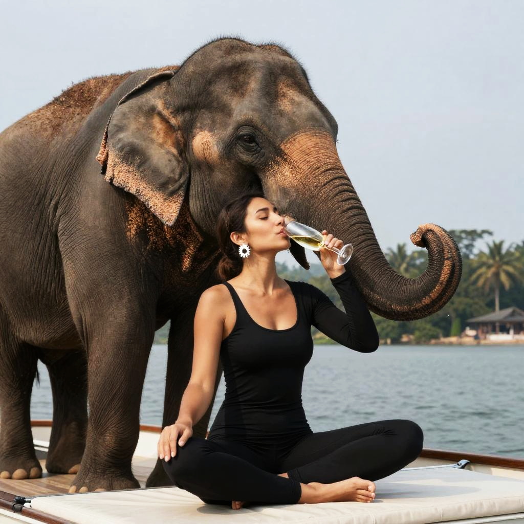 Realistic photo.a elephant with grey skin, realistic, sitting on a boat and doing yoga in jet black jumpsuit, with a silver earrings, sipping champagne. tranquil atmosphere, with sunny rays. realistic photo