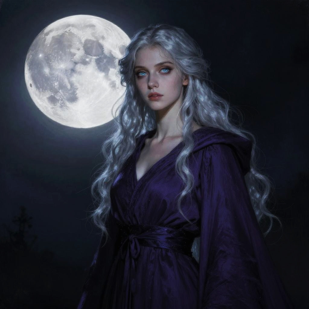 Realistic photo.A detailed painting of a mysterious sorceress in a dark purple robe with silver hair and glowing eyes, standing in front of a full moon. Inspired by John William Waterhouse, the scene has a dark background that enhances the rich colors and fine details of the character. The composition exudes a moody, atmospheric quality, combining classic beauty with a mysterious, nocturnal ambiance. realistic photo