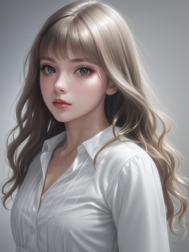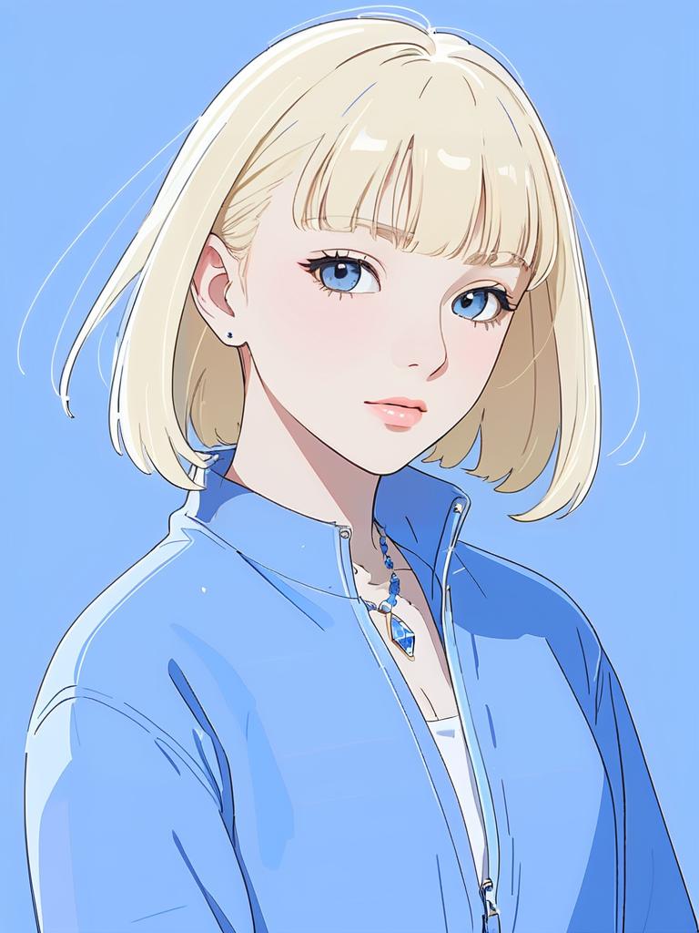 A confident young woman with short blonde hair and blue eyes wearing a blue zip-up jacket with a gemstone necklace, anime portrait, clean lines, soft shading, cel shading, bright blue and blonde color scheme, detailed facial features, casual pose, minimal background