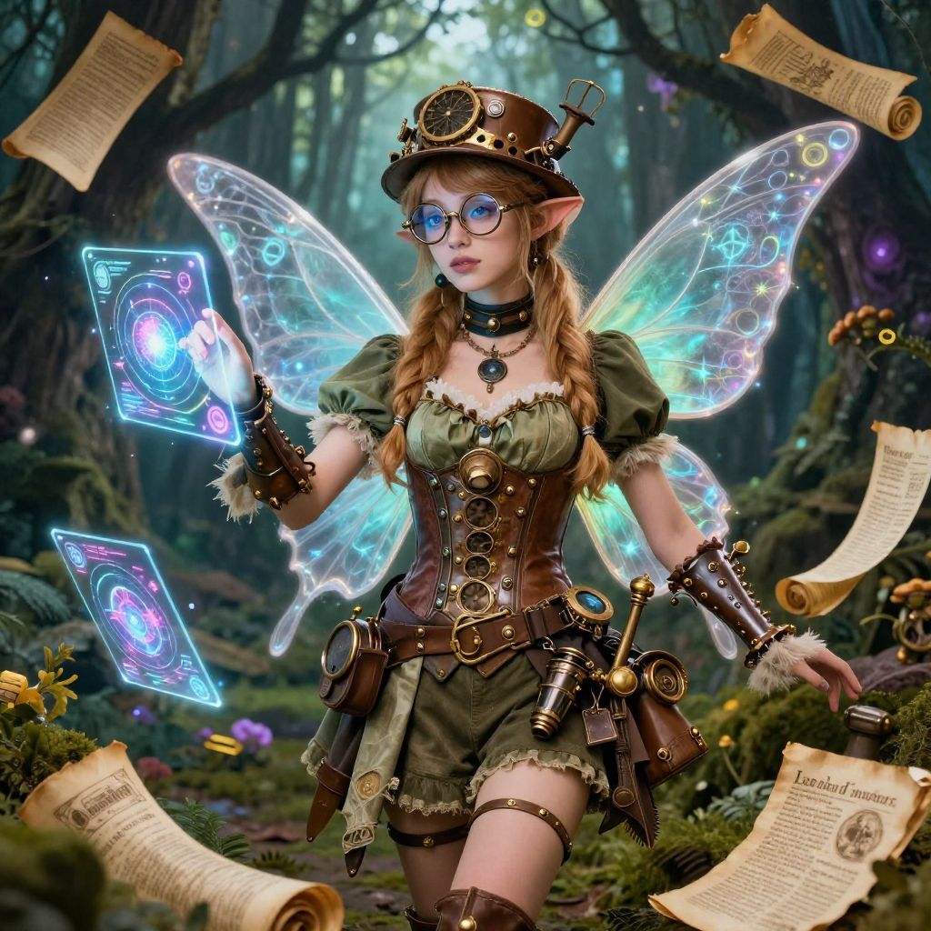 Nerdy fairy in a steampunk-inspired outfit, surrounded by floating holograms and ancient scrolls, magical forest background, intricate details, vibrant colors