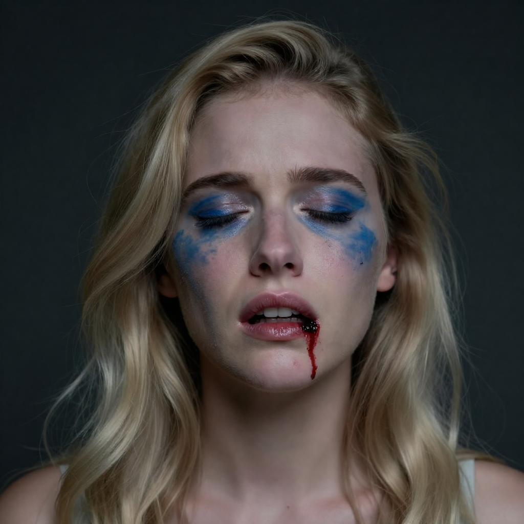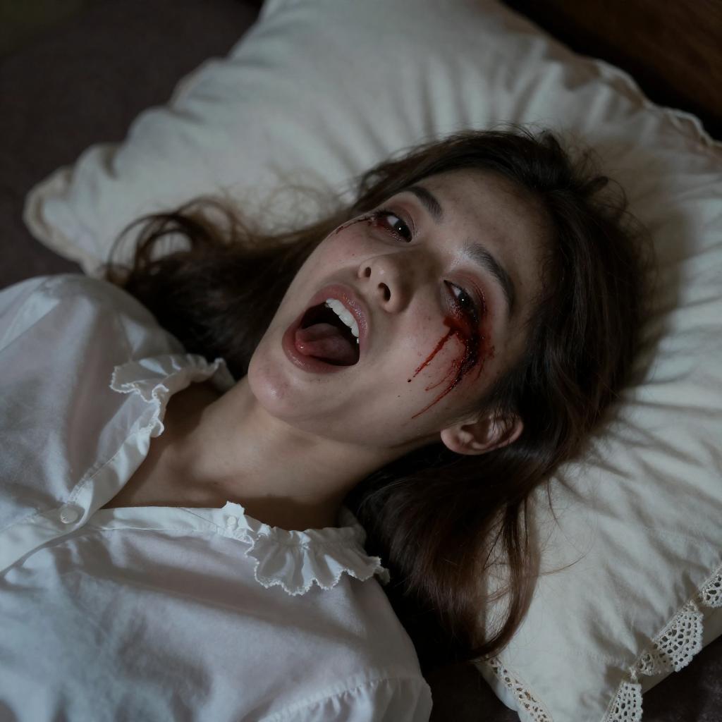 Close-up of a young woman with brown hair lying on a white pillow with lace trim. She has blood smeared under her eyes, her mouth is open with tongue visible. She is wearing a white blouse with a ruffled collar. The background is dark, creating a dramatic and eerie atmosphere.