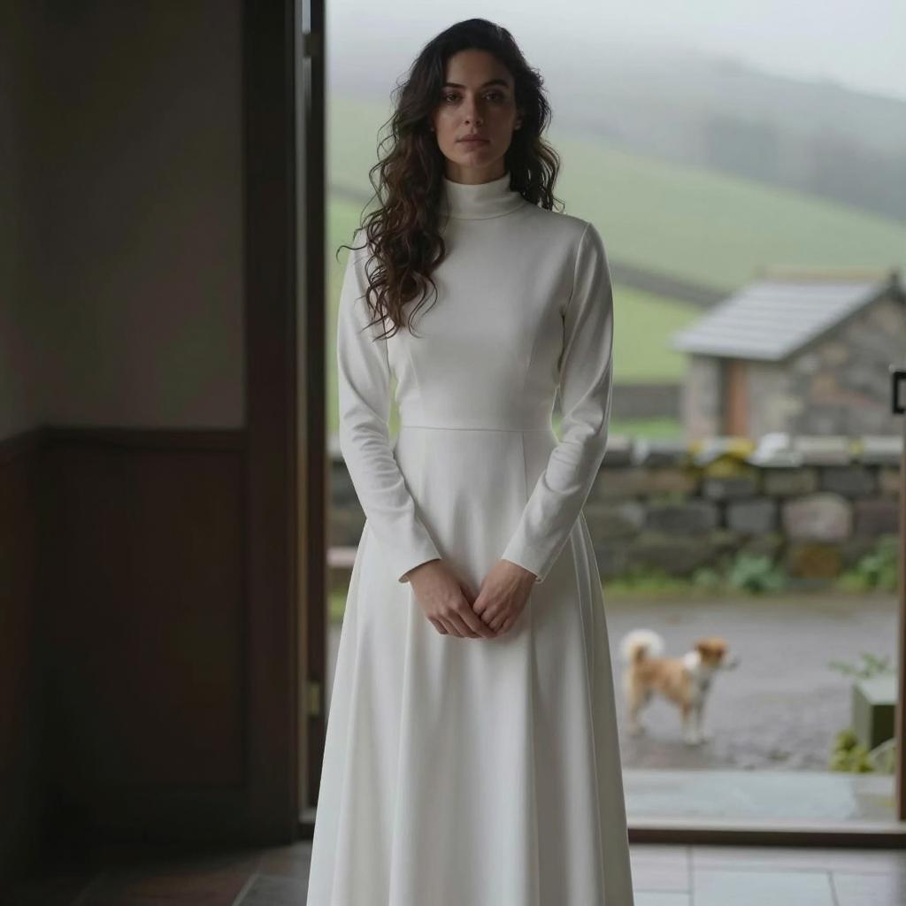A woman with wavy dark hair, wearing a long, white, high-collared dress, standing indoors with hands clasped in front. Background shows a misty, outdoor setting with green hills, stone structures, and a small dog on the ground. Dark, shadowy interior on the left.