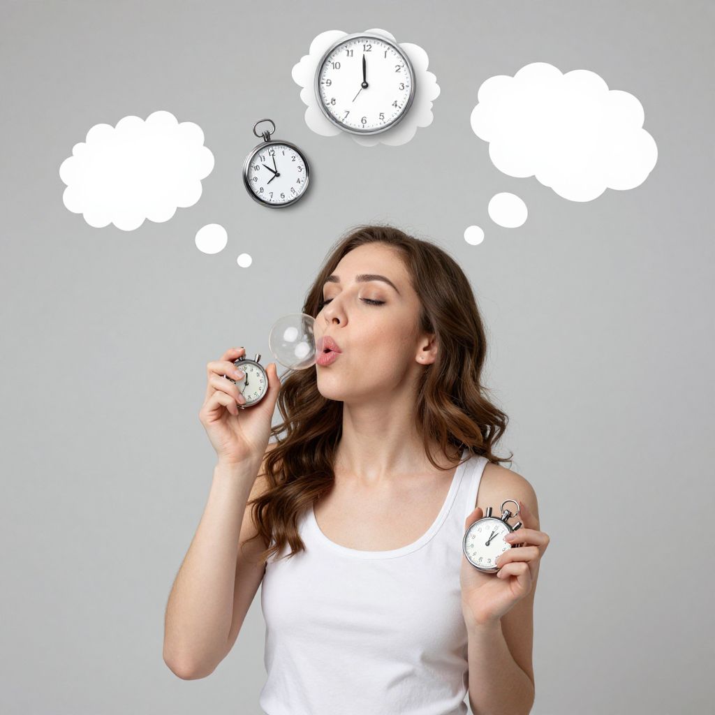 A woman playfully blows a bubble with a stopwatch, as clocks and whimsical thought bubbles float above her head, merging the passage of time with the act of indulgence in a surreal, imaginative tableau.
