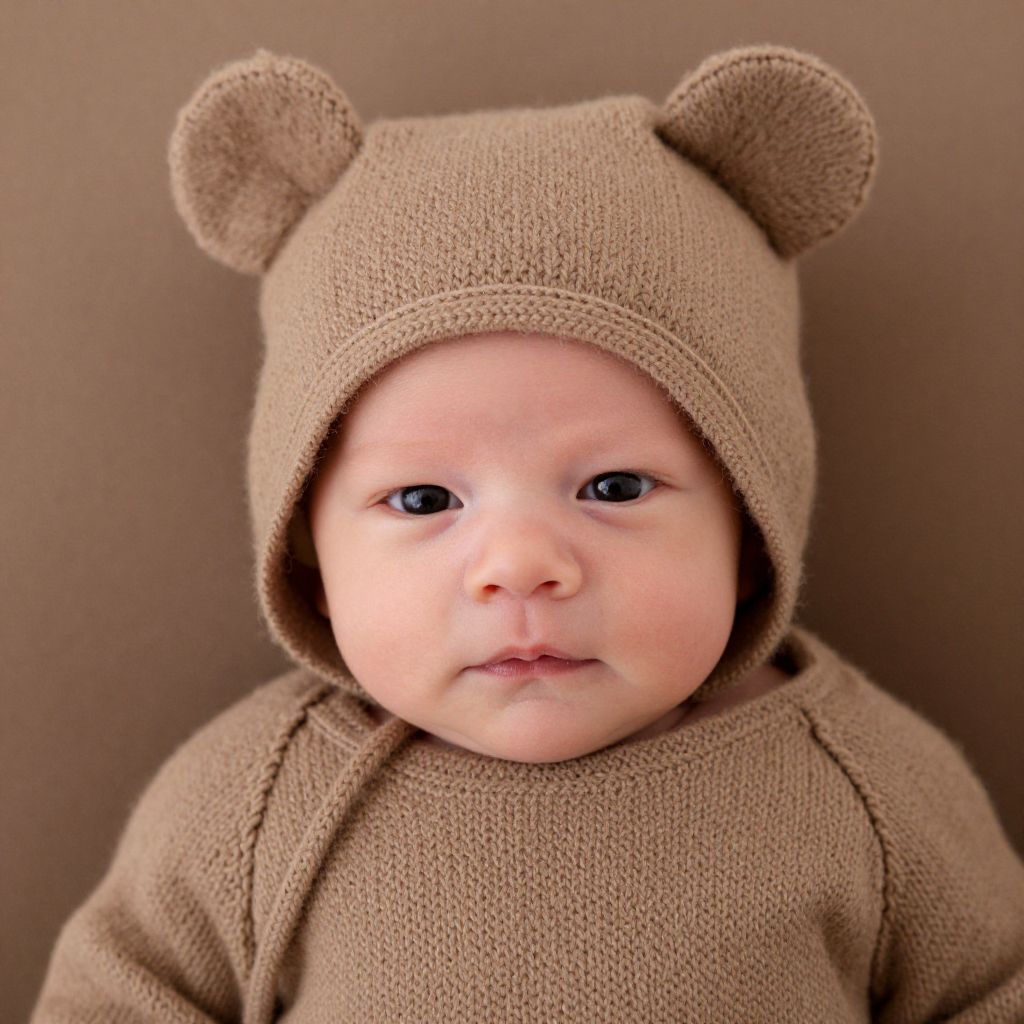 Photograph of a fair-skinned, chubby-cheeked baby with round, dark brown eyes, wearing a beige, knitted bear-themed hooded onesie. The onesie has two small bear ears on top of the hood and a textured, cozy knit fabric. The baby's expression is neutral, with slightly parted lips. The background is a plain, solid brown, which complements the onesie's color. The image is softly lit, highlighting the baby's soft skin and the texture of the knit fabric. The focus is sharp on the baby's face, with a slight blur on the background.