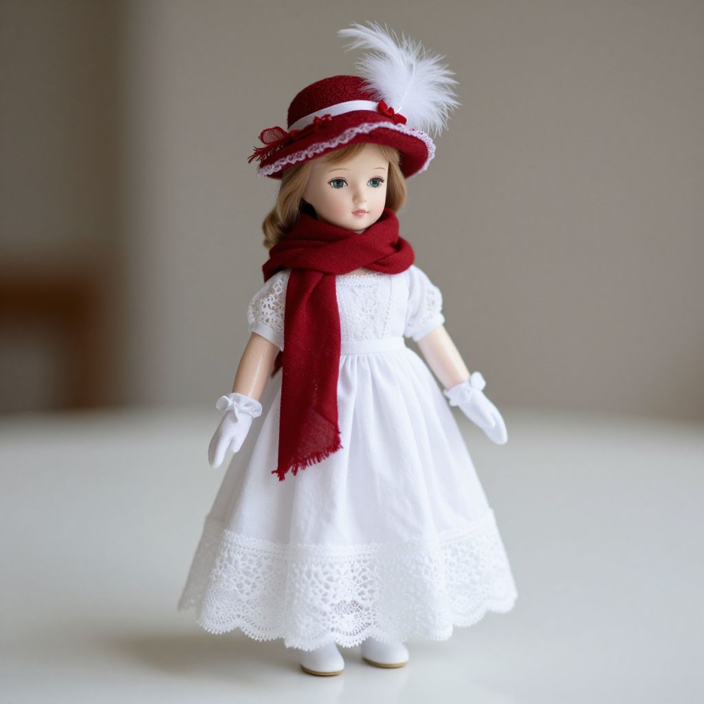 A delicate porcelain doll standing on a smooth white surface, dressed in a flowing white dress with delicate lace details, wearing a vibrant red scarf wrapped elegantly around her neck. She is adorned with a matching red and white feathered hat that perches securely on her head, and pristine white gloves that cover her hands. Her expression is serene and gentle, with soft, glowing eyes that catch the light. The scene is softly lit, creating a dreamy, nostalgic atmosphere, emphasizing the doll's timeless charm and elegance.