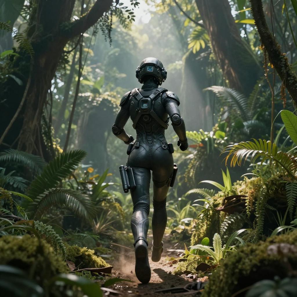 Rear view of a futuristic female special forces soldier wearing a high-tech jet black exo suit and helmet running through a dense, lush alien jungle. The scene features rich vegetation, god rays filtering through the canopy, and cinematic lighting with deep shadows and soft bloom effects. The soldier's toned and muscular physique is highlighted as she moves swiftly along a forest path surrounded by ferns and moss-covered terrain.