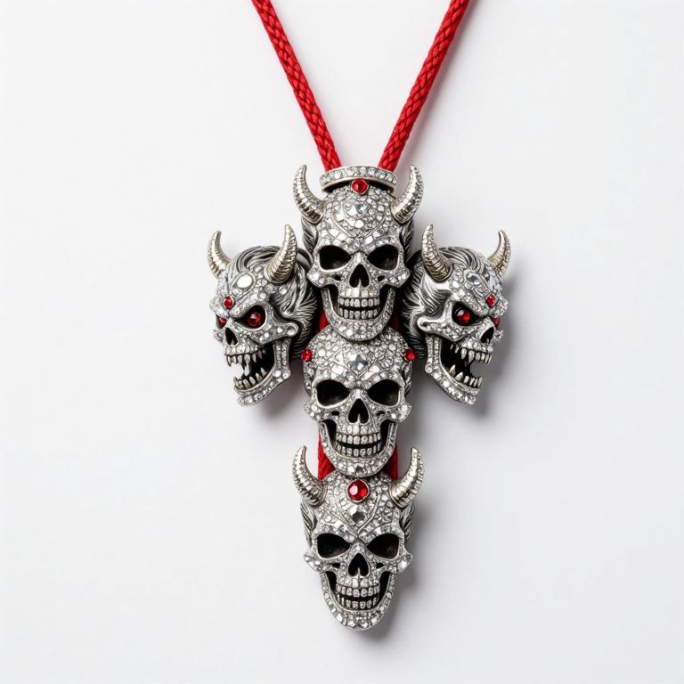 Photograph of a silver skull pendant with a teardrop-shaped blue gemstone, hanging from a delicate chain against a light gray background.