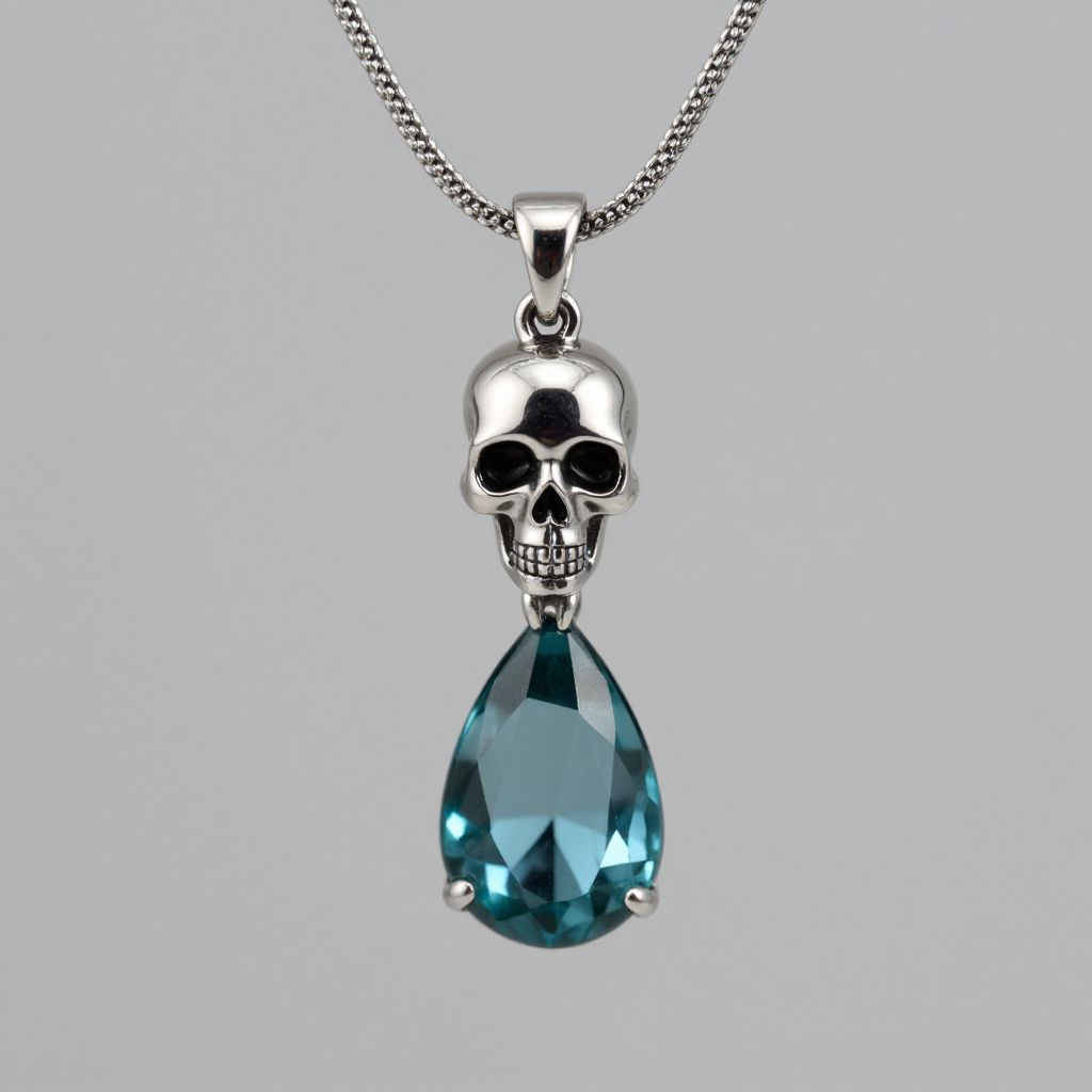 Elegant Skull Pendant Necklace featuring a polished silver skull charm suspended above a faceted teal crystal teardrop, elegantly linked by a textured chain against a minimalist background.