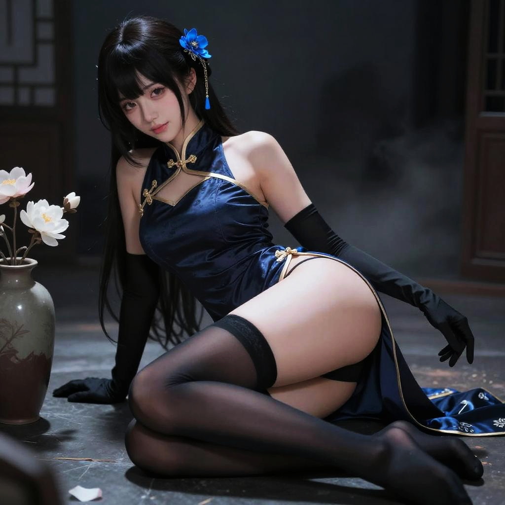 Photograph of an East Asian woman with long black hair, adorned with a blue flower, wearing a black silk cheongsam dress with gold trim, black thigh-high stockings, and long black gloves. She is kneeling on a dark, glossy floor, with her left hand on the ground and right hand resting on her thigh. Her dress is slightly lifted, revealing her bare buttocks. In the background, there's a vase with white flowers to the left and a dark wooden panel. The lighting is dim, highlighting her pale skin and the sheen of her outfit. The overall atmosphere is sensual and elegant.