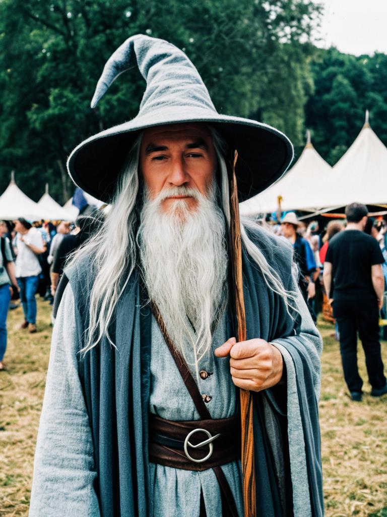 Man in Gandalf costume, candid cosplay portrait at fantasy festival