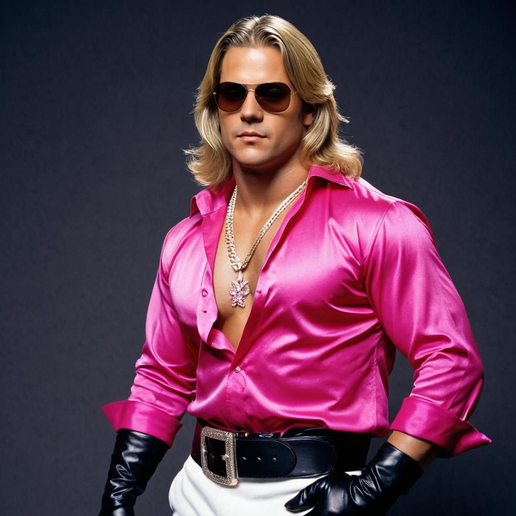 Bret hitman hart fancy dress,male focus, 1boy, solo, sunglasses, blonde hair, shirt, belt, open shirt, realistic, open clothes, gloves, pants, pink shirt, necklace, jewelry