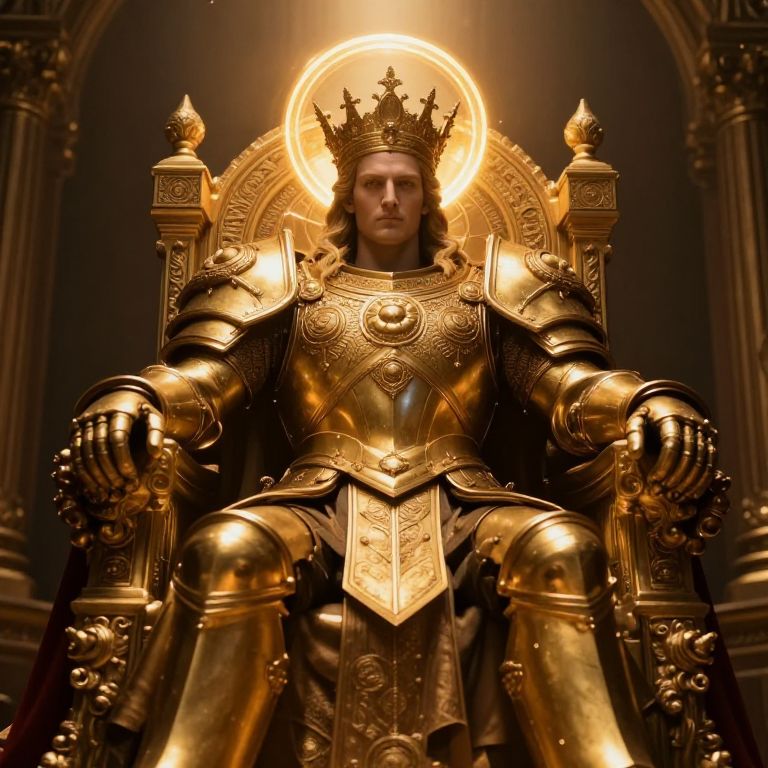 Photorealistic digital image of a golden-armored king with a crown, sitting on an ornate throne, halo glowing behind his head.