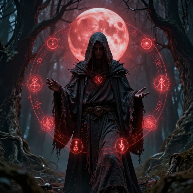 A dark, digital fantasy illustration features a hooded, shadowy figure with tattered robes standing in a misty, moonlit forest. A large, glowing red full moon is in the background, casting an eerie light. The figure has its arms raised, surrounded by a glowing red circular aura of magical symbols and icons, including a pentagram, an eye, and various runes. The forest is dense with twisted, bare trees, and the ground is covered in roots and shadows. The overall mood is ominous and mystical, with a strong contrast between the dark figure and the bright red moon and symbols.