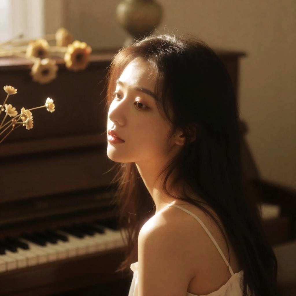 A soft-focused, dreamy portrait of a woman sitting in front of a piano surrounded by delicate, dried flowers with warm ambient lighting, golden and brown color scheme, cinematic soft glow, romantic atmosphere, bokeh highlights throughout the scene