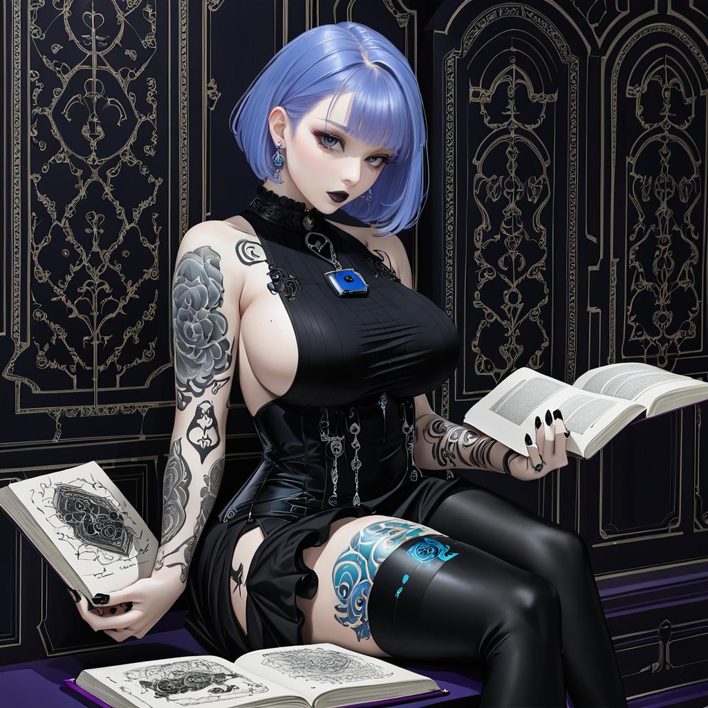 1girl, Blue Lock, breasts, earrings, ass, arm tattoo, black nails, dress, solo, leg tattoo, makeup, book, short hair, underbutt, holding, large breasts, eyeshadow, sleeveless, goth fashion, sideboob, short dress, black dress