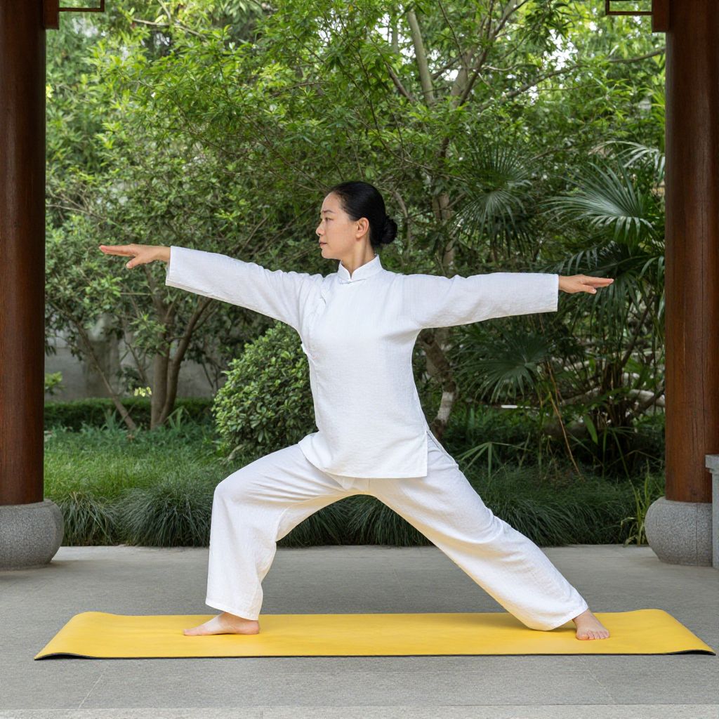 Photograph of a woman practicing tai chi outdoors. She is in a white traditional martial arts uniform, with her black hair tied back in a ponytail. She stands on a yellow yoga mat, performing the "wide horse" stance with her right leg bent and left leg extended, arms outstretched to the sides. The background features lush green trees and bushes, framed by dark wooden pillars. The concrete ground contrasts with the vibrant mat, and her focused expression indicates concentration. The image is brightly lit, highlighting the natural setting and her serene practice.